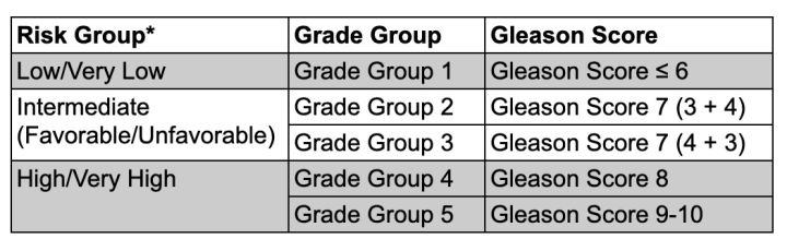 *Risk Groups are defined by the Grade Group of cancer and other measures, including PSA, clinical tumor stage (T stage), PSA density, and the number of positive biopsy cores.