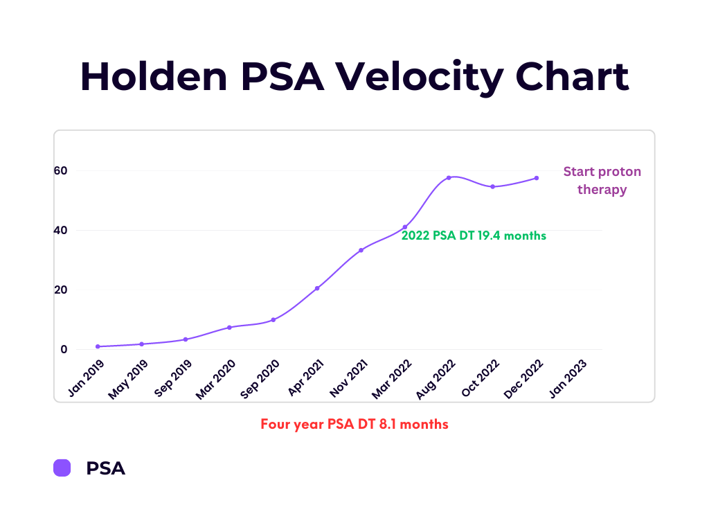 I kept a chart measuring how fast my PSA level doubled for the next four years. This is also known as the PSA doubling time (DT), which indicates the rate of tumor growth. A DT of fewer than 10 months generally indicates aggressive cancer, while a DT of more than 24 months may suggest slow-growing cancer.