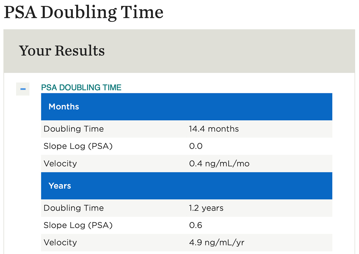 Since my PSA level of 0.9 in January 2019, my PSADT has been 6 months, but I did have a six-month period where the rise dramatically slowed. It was during the period from March 2020 to September 2020 that my PSADT went from 6 months to 14.4 months. You can find an online nomogram for calculating PSADT here.
