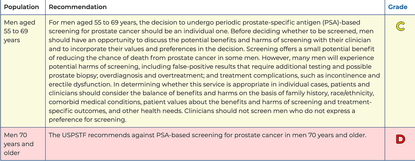 In 2018, the USPSTF task force published their evidence report Prostate-Specific Antigen–Based Screening for Prostate Cancer, and concluded:
