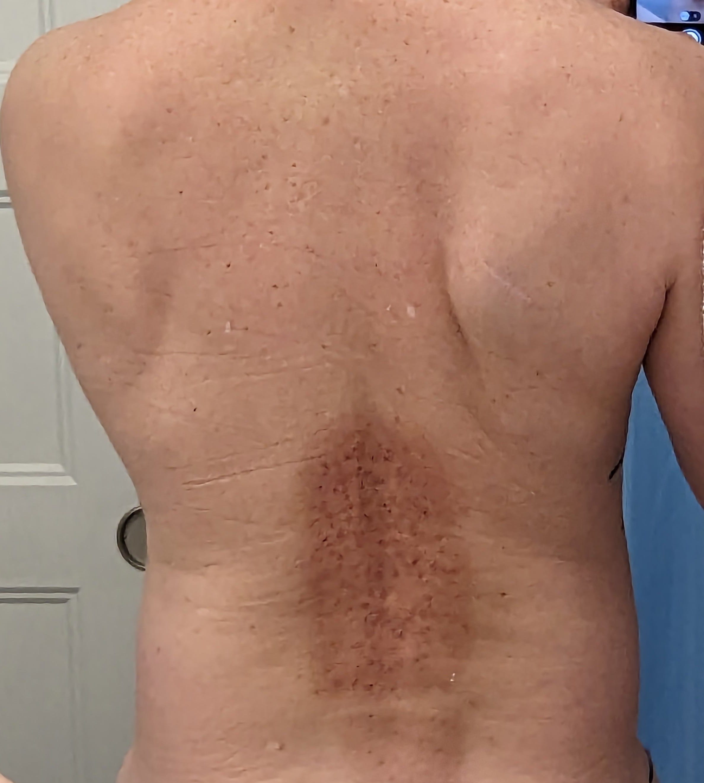 I experienced one more side effect, and that it's what I call my proton sunburn. I called it a sunburn because it eventually turned brown like a tan. It never blistered, and it wasn't painful. It just itched a bit after a shower.