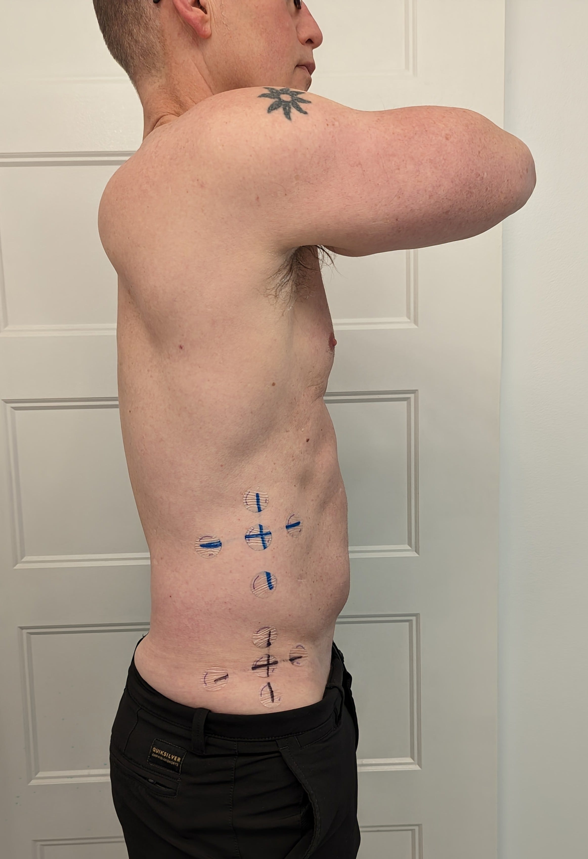 During the planning CT, the technicians used a Sharpie pen to mark my skin to help align me with the machine. Then they covered the marked areas with clear round adhesives so the marks wouldn't disappear when I showered. During treatment, I lay on a computer-controlled table, which the technicians moved to align the spots on my skin with lasers in the proton room. This alignment helped accurately direct the proton beam.