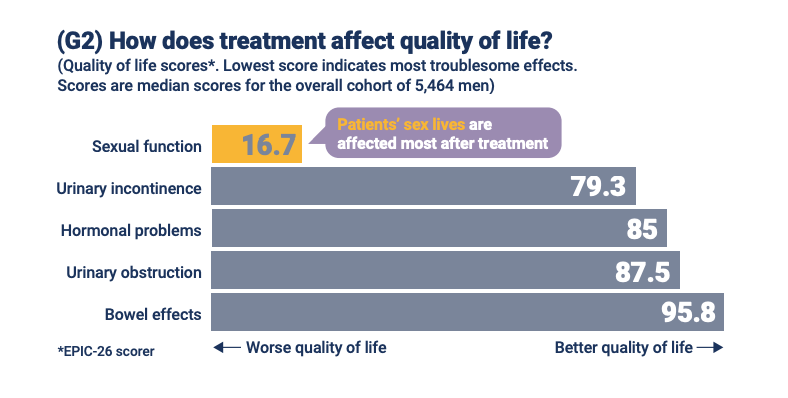 Chart G2 shows how treatments affect different aspects of quality of life, with men's sex lives most negatively impacted. Keep in mind that just under 60% of these men had undergone a radical prostatectomy.