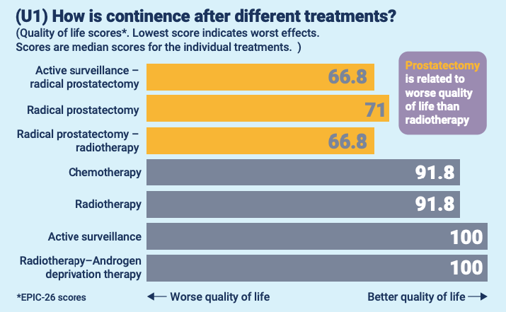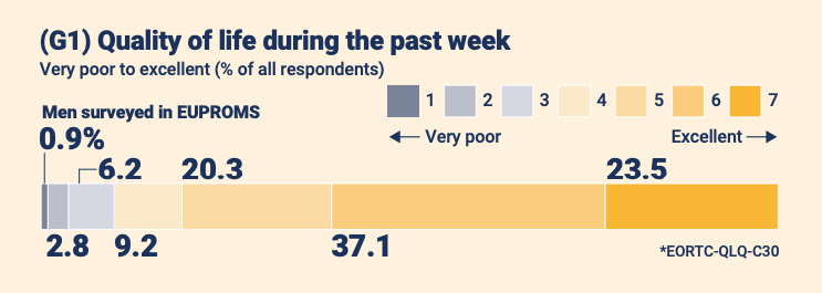 Europa Uomo permits the publication of their results and charts as long as I credit the EUPROMS studies. This study used validated quality-of-life questionnaires: EPIC-26, EORTC-QLQ, and EQ-5D-5L; the responses were anonymous.