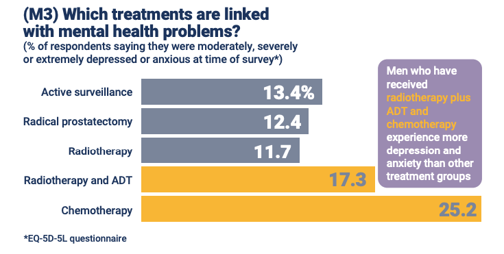 The following chart breaks down which treatments are most associated with mental health problems. Again, the study shows that the more treatment and the more advanced the disease, the more mental health problems increase.