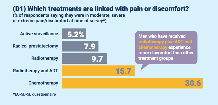 Pain and discomfort increased as men progressed through the treatment stages. Men who received radiation plus androgen deprivation therapy and chemotherapy experienced more discomfort than other treatment groups.