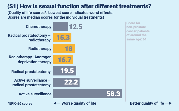 The following chart looks at quality of life scores for sexual function after specific treatments, with lower scores representing the worst quality of sexual function. The average score for men of the same age without prostate cancer is 61, which is close to the score for active surveillance.