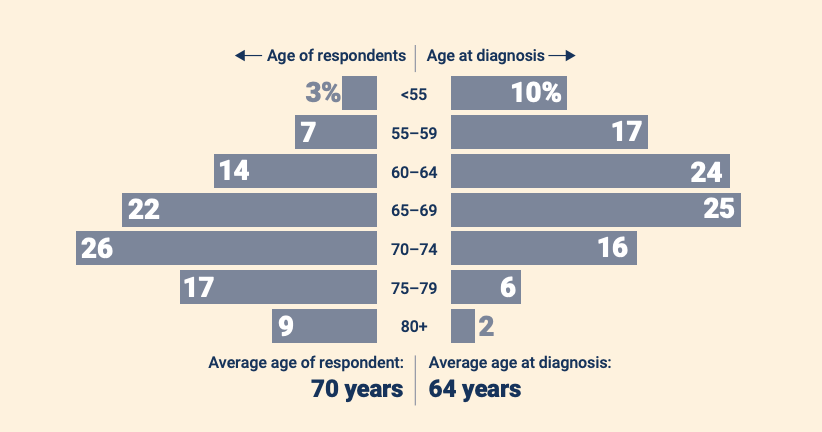 The average age at the time of the survey was 70, and the average age at diagnosis was 64, with more than 50% of respondents diagnosed before age 65.