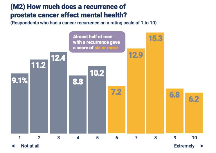 The following chart shows how a diagnosis of recurrence of prostate cancer impacts mental health. Almost 50% of respondents diagnosed with recurrence rated the mental health effect at a 6 or higher on a scale of 1 - 10, with 10 being extremely impactful.