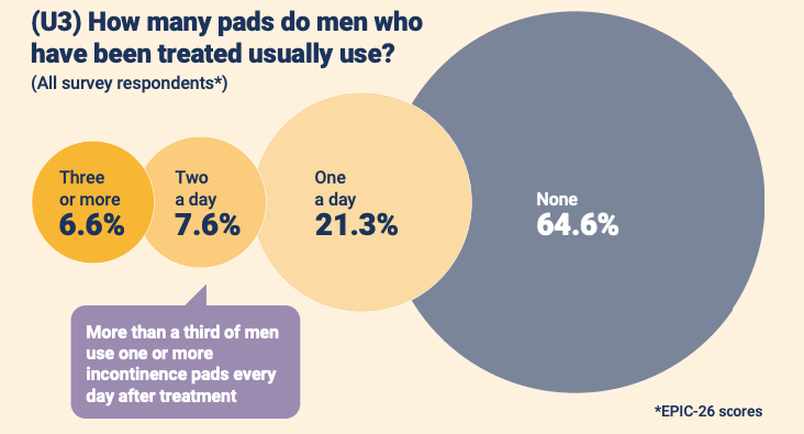 The survey asked how many incontinence pads they use daily, and 36% reported using one or more pads daily. To put this into context, a 2017 study of men about the same age undergoing active surveillance found that around 10% wear pads.