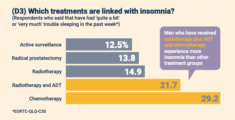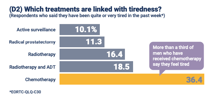 Chemotherapy was most associated with fatigue, with 36% of men who had undergone chemotherapy reporting feeling tired. This association did not mean men were necessarily undergoing chemotherapy at the time of the survey, but the fact they received chemotherapy indicates advanced disease.