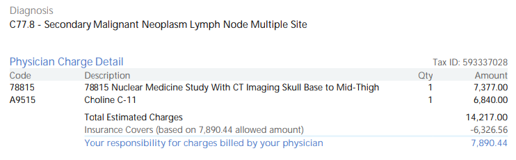I discovered that the Mayo Clinic would bill my insurance $14,217.00 for the scan, of which my out-of-pocket cost would be $7,890.44 despite having already met my deductible. Mayo Clinic charges $7,377 for a base PET CT scan and $6,840 for the Choline C-11 tracer they inject into your vein. That is some serious cost per ounce.